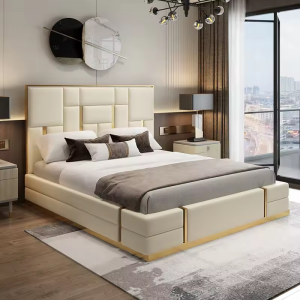 Light luxury modern bedroom leather gold stainless steel wedding bed for bedroom furniture