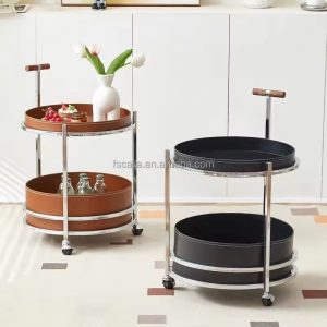 Top Quality Industrial Round Coffee Table With 2-Layer Leather Coffee Table and pulley wheel leg for living room furniture