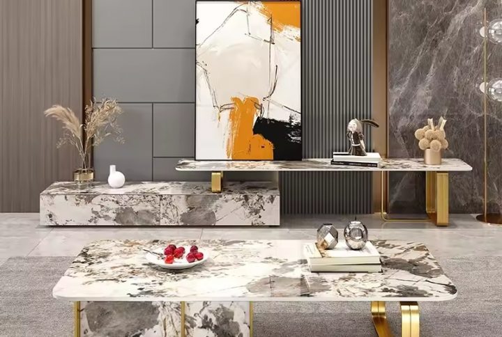 Living room Coffee table with gold stainless steel frame marble top sofa table and tv stand set furniture