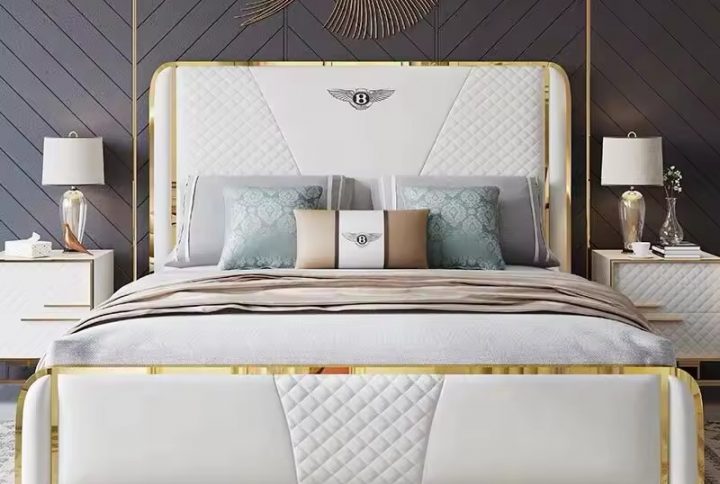 Luxury gold stainless steel headboard chesterfield leather bed frame full size couple queen double bed solid wood bed