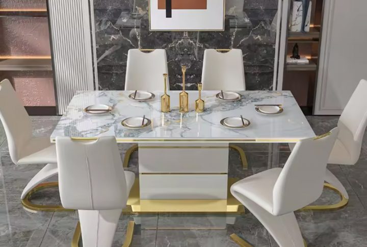 Be the first to review “Luxury stone marble modern stainless steel rectangular white dining table set with 6 seater restaurant table and chair furniture”