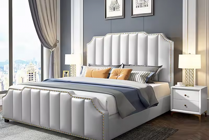 Modern Luxury bedroom furniture leather bed set white high headboard double king size pocket spring bed mattress for hotel