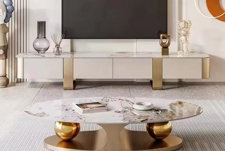 Modern luxury white leather oval coffee table and tv stand cabinet with marble top for lining room sofa furniture